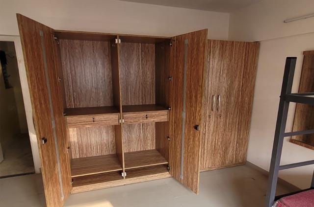 Providing and installing 6 door Plywood wardrobes, MS bunk bed, Dressing Units and study tables for 97 Rooms in Nurse Hostel.